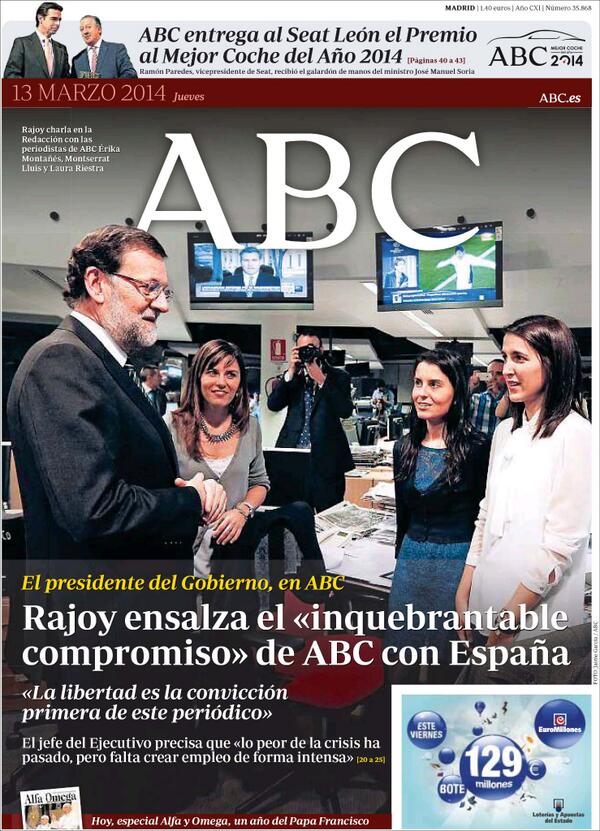 – Este capítulo de Repronto muestra cómo el partidismo a priori ha conducido a que los informativos dejen de mirar «lo que pasa ahí fuera». Vean como ejemplo la portada anteayer del diario ABC, donde se cita a sí mismo seis veces -sin contar la cabecera- y donde no hay el mínimo rastro del mundo exterior. Pueden verla aquí.
